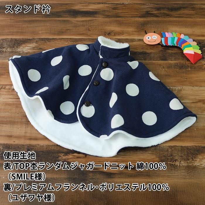 表生地はスムースニット、裏生地はプードルファー、ファー生地は初めてで、しかも毛足が1.5cmと結構長いので難しかったです。熊のボタンは飾りにして、タブと身頃を縫い付けのスナップボタンで止めるようにしました。裁断の段階で質問させてもらい、早々とご親切な回答を頂きありがとうございました。説明書もわかりやすく、お陰様で満足のいくマントができました。