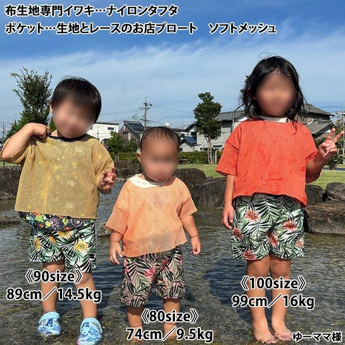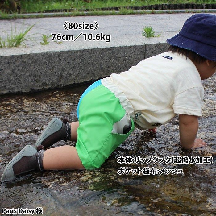 ポケットにメッシュ生地を使い、水遊びの時、水がすぐに抜けるようにしています。