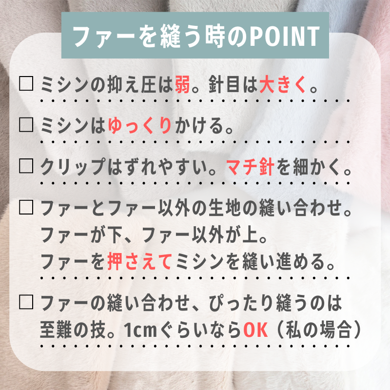 ただ、ファー生地は少し扱いがむずかしい素材でもあります。