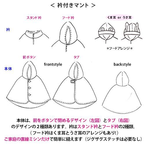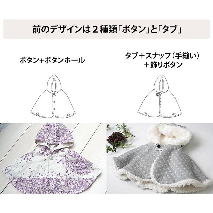 表生地はスムースニット、裏生地はプードルファー、ファー生地は初めてで、しかも毛足が1.5cmと結構長いので難しかったです。熊のボタンは飾りにして、タブと身頃を縫い付けのスナップボタンで止めるようにしました。裁断の段階で質問させてもらい、早々とご親切な回答を頂きありがとうございました。説明書もわかりやすく、お陰様で満足のいくマントができました。