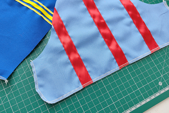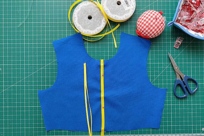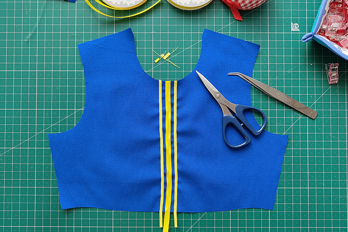 前身頃の上に、イエローのテープを3本、ミシンでたたきつけます。