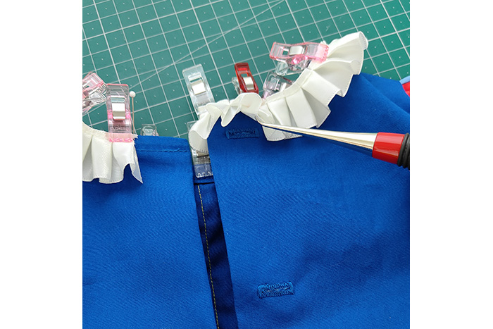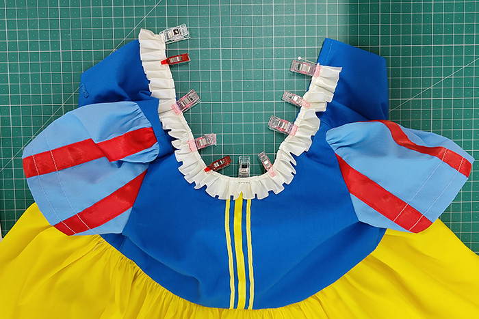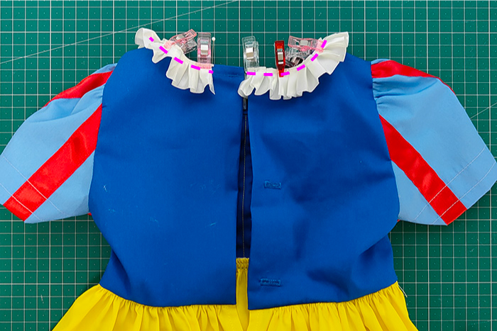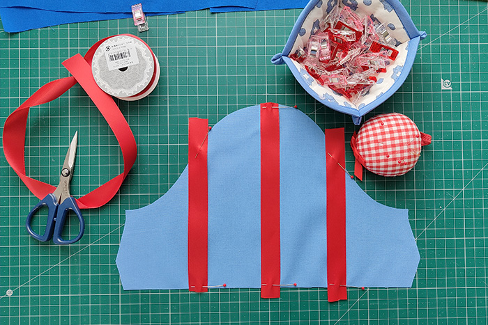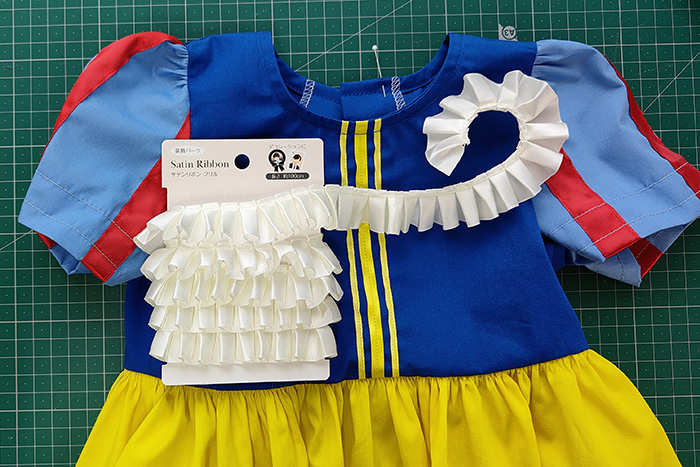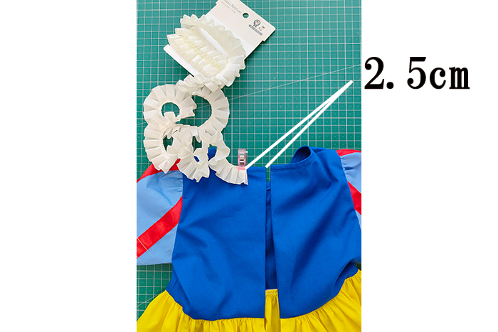 端から0.5cmのところをミシンで縫い、白いリボンを身頃に付けます。