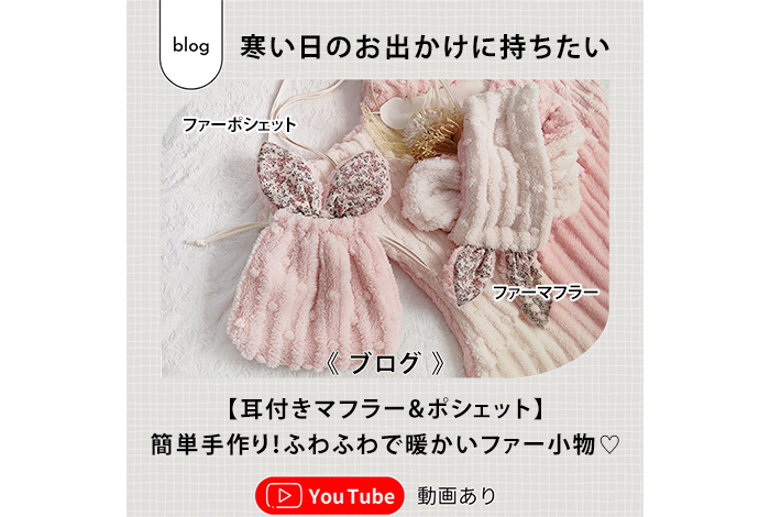 家庭用ミシンで作成できて、縫い代が隠れてすっきりキレイに仕上がる!「ファーマフラー」と「ファーポシェット」のご紹介です(*ˊᗜˋ*)