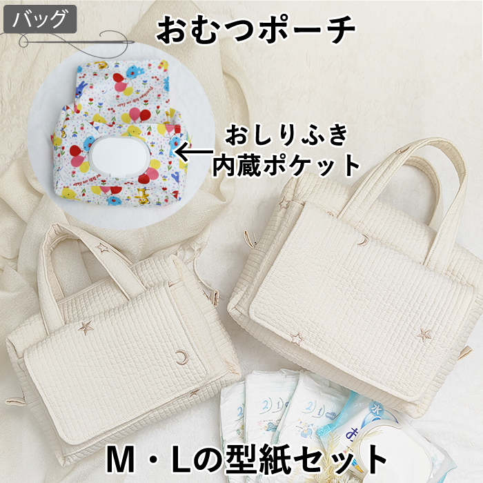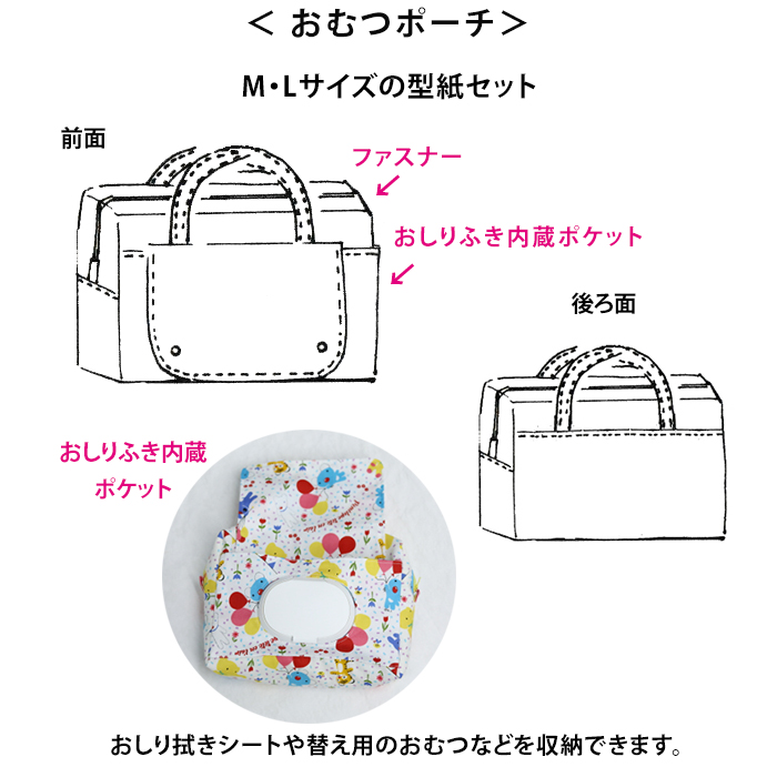 ママ必見!!「おしりふき内蔵ポケット付き」のオムツポーチ。Mサイズ・Lサイズの型紙セット。